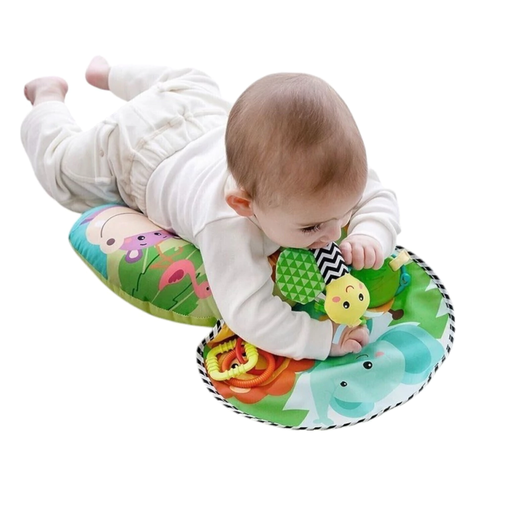 A almofada de atividades BUBA acompanha o bebê em suas divertidas fases de desenvolvimento. Seu formato de meia lua é extremamente confortável para o bebê se apoiar de bruços na almofada macia e brincar com conforto.