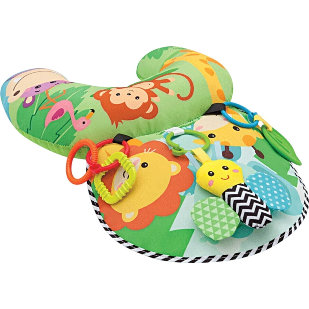 Nessa posição, a coordenação motora será estimulada, pois ele terá ao seu alcance vários brinquedos como mordedor, argolas texturizadas, abelha com som de amassado, cores e estampas vibrantes, além de um painel super colorido com um animal e som de amassado para o bebê tocar.