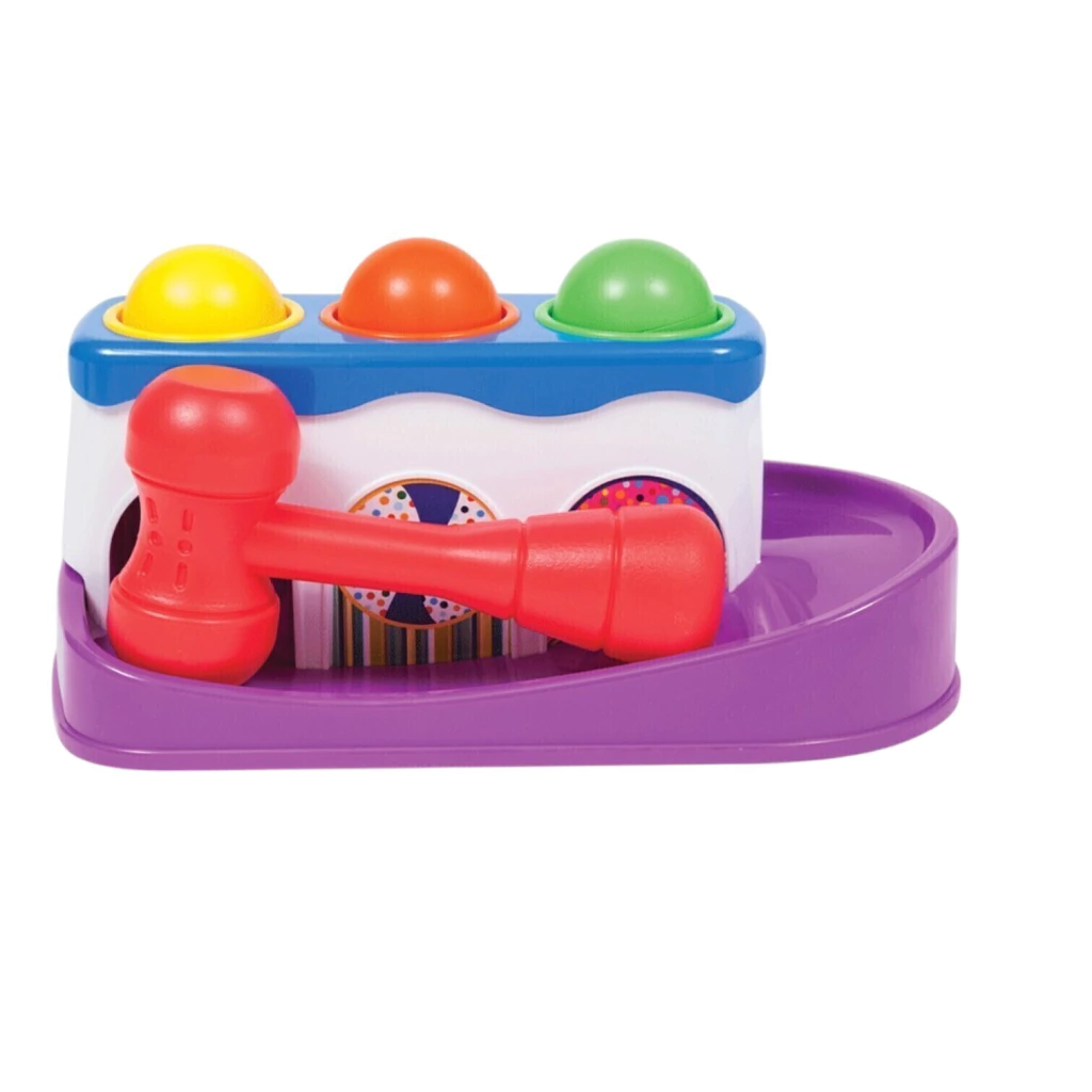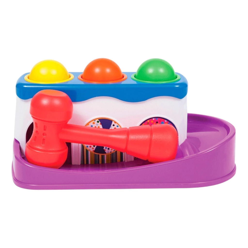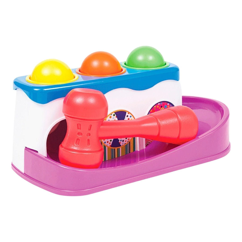 Ao bater o martelo, a bolinha cai e faz a alegria dos pequenos, que enquanto brincam, tem seus sentidos estimulados.