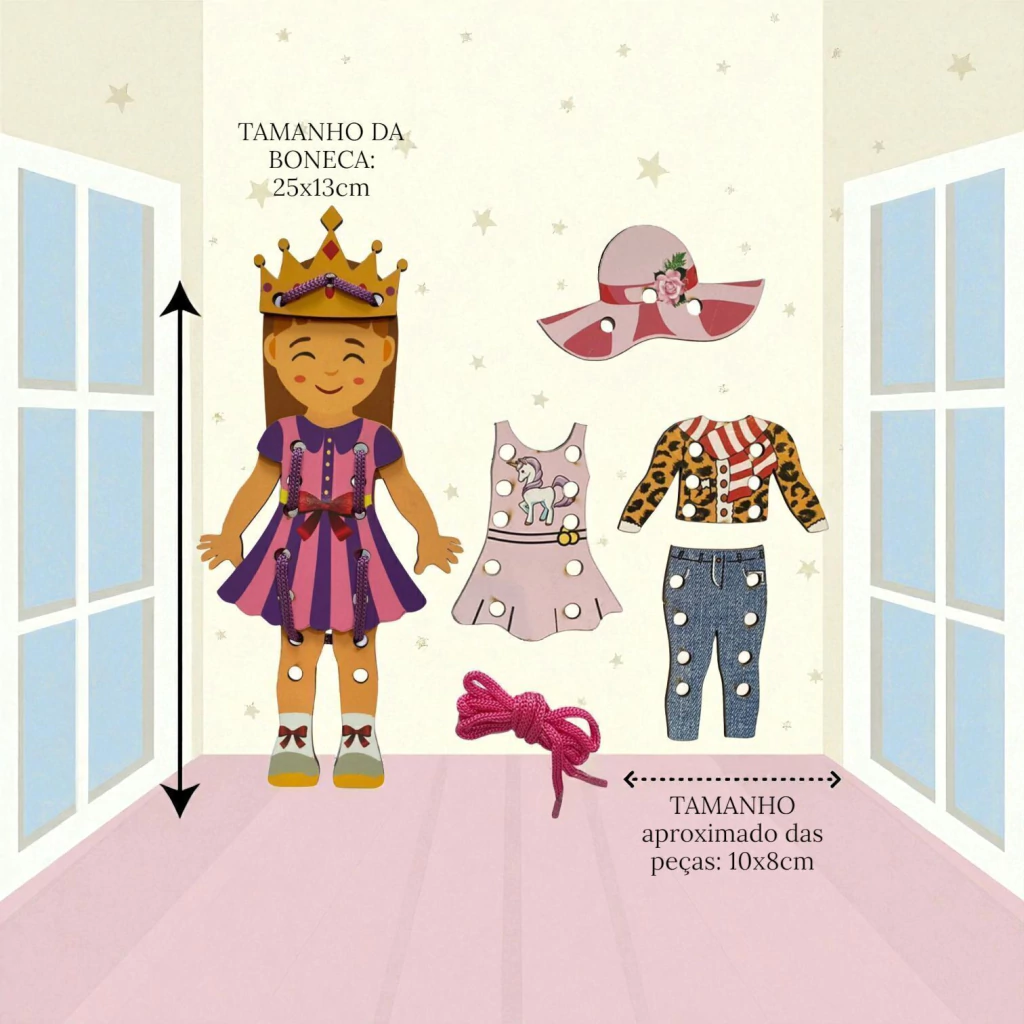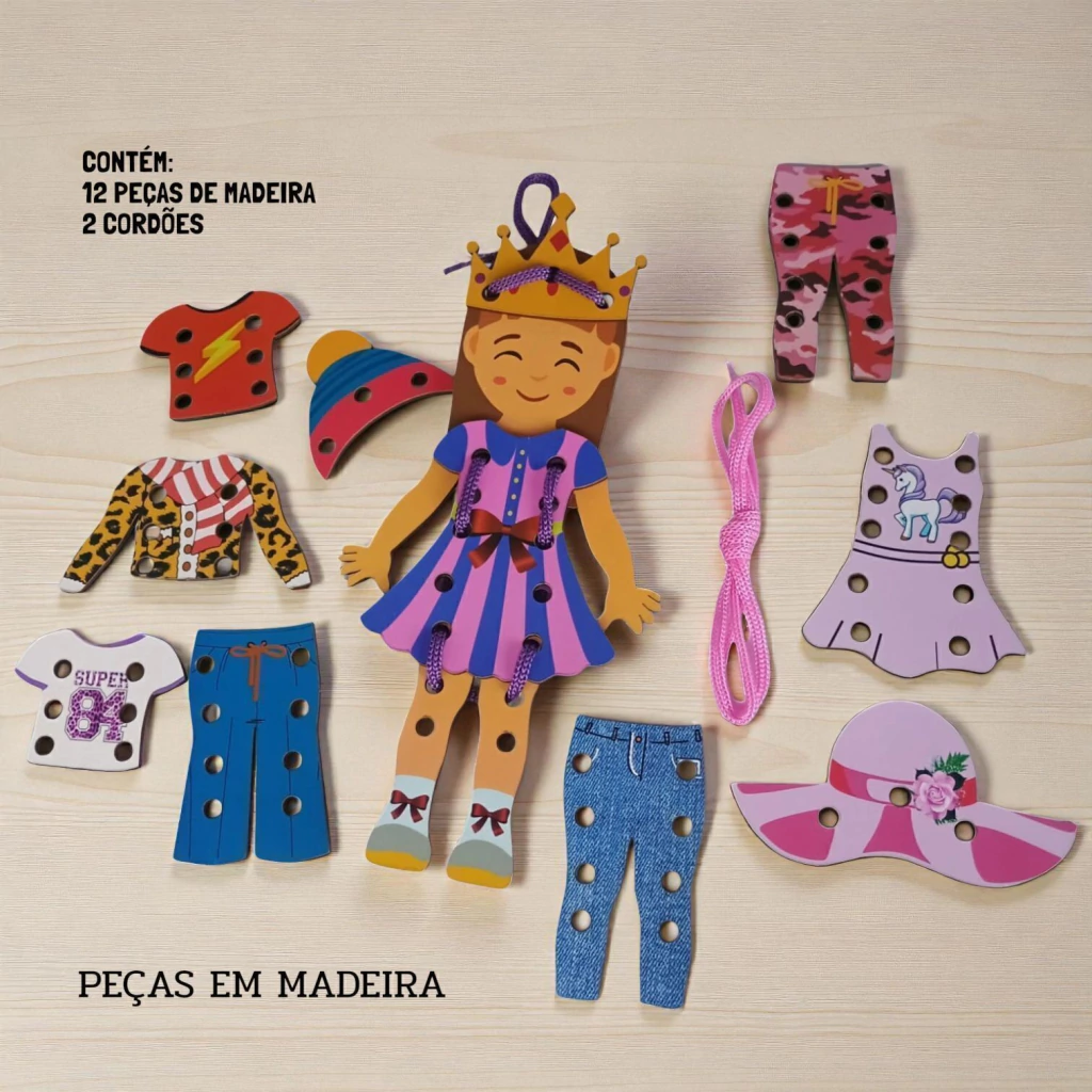 COMPOSTO POR: 12 peças de madeira (1 princesa +11 roupas de madeira) e 2 cordões.