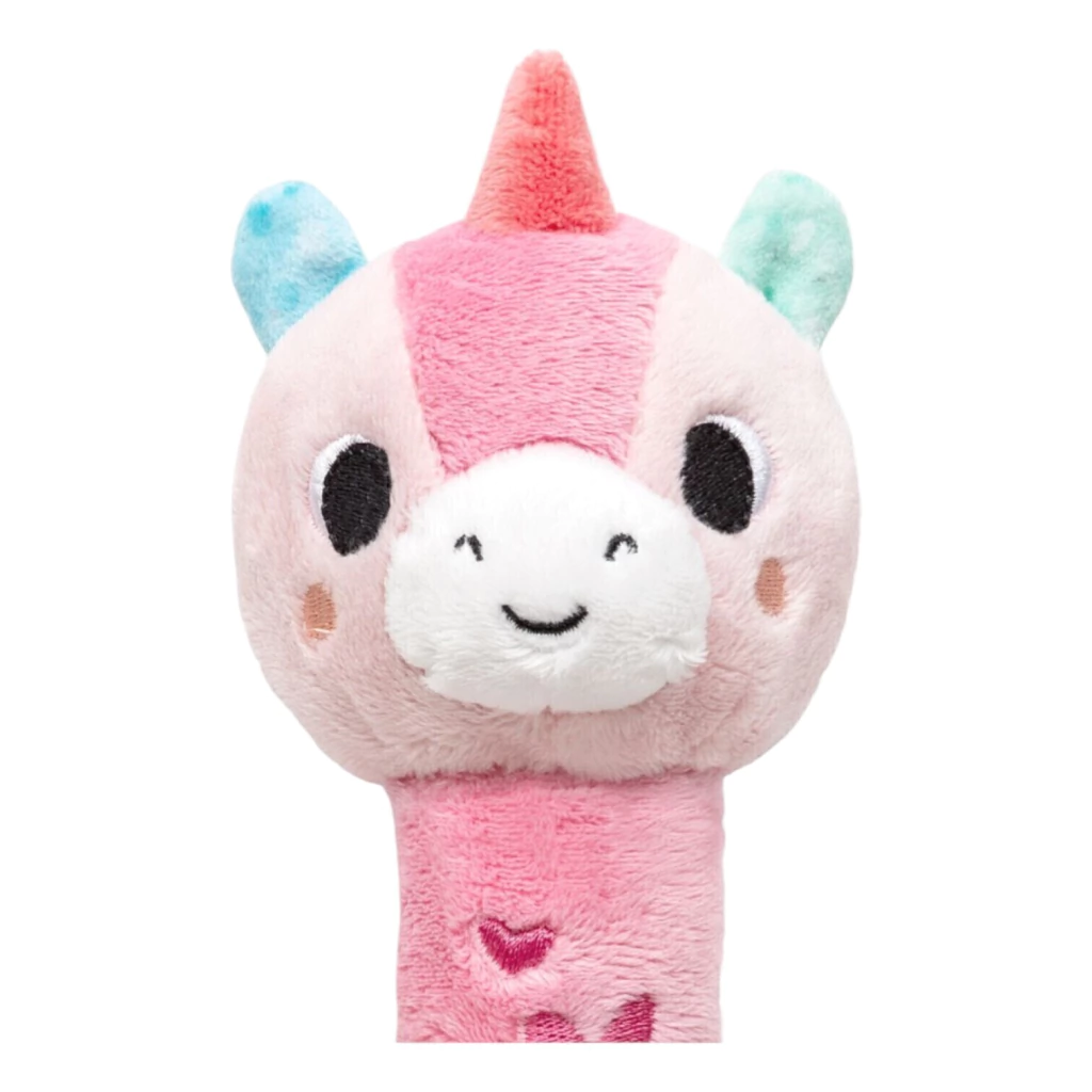 Na sua ponta vem um mordedor que ajuda a coçar a gengiva durante o período de dentição e quando apertado, ele faz barulho de buzina, fácil do bebê segurar.