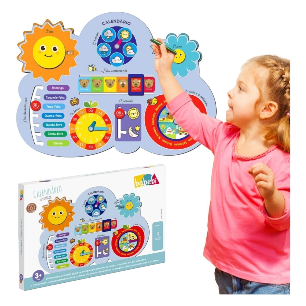 O Calendário Animado ajuda as crianças a se situarem no tempo. À medida em que elas giam e manuseiam as peças aprendem sobre as horas, dia do mês, da semana, as estações e clima de maneira lúdica e criativa.
