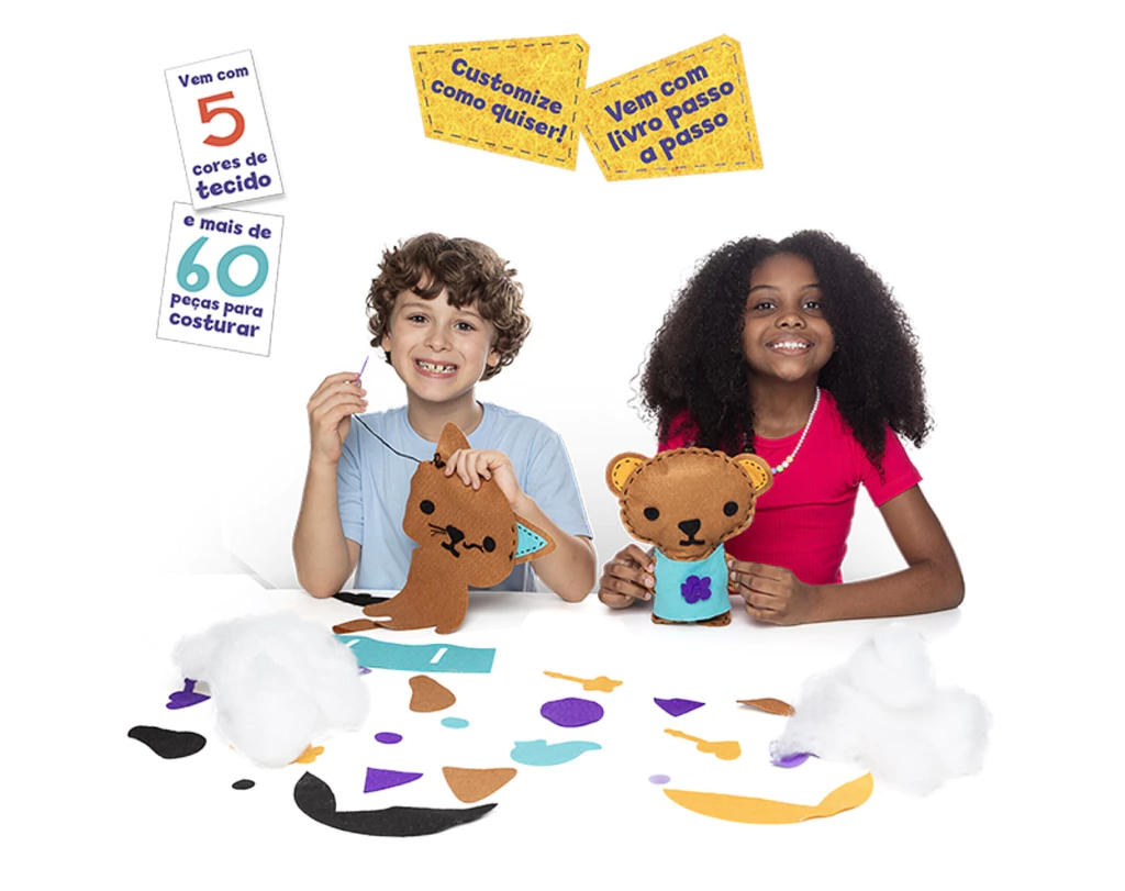 Crie um boneco do seu jeito com este livro que ensina passo a passo como costurar. O kit vem com o feltro, linha, agulha e enchimento inclusos.