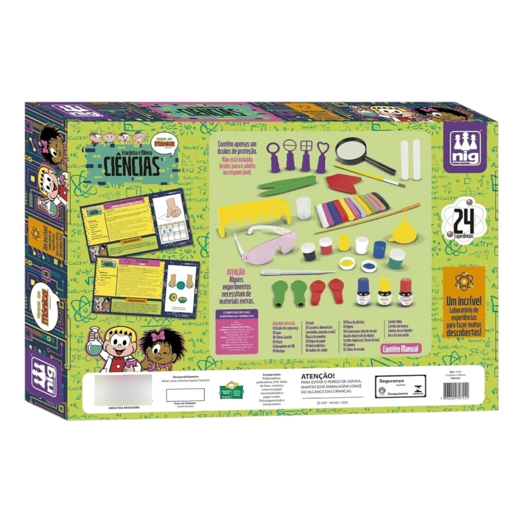 Acompanha: 02 tubos de ensaio, 01 lupa, 01 óculos de segurança, 01 pipeta, funil, corantes, guaches, massinha e muito mais!