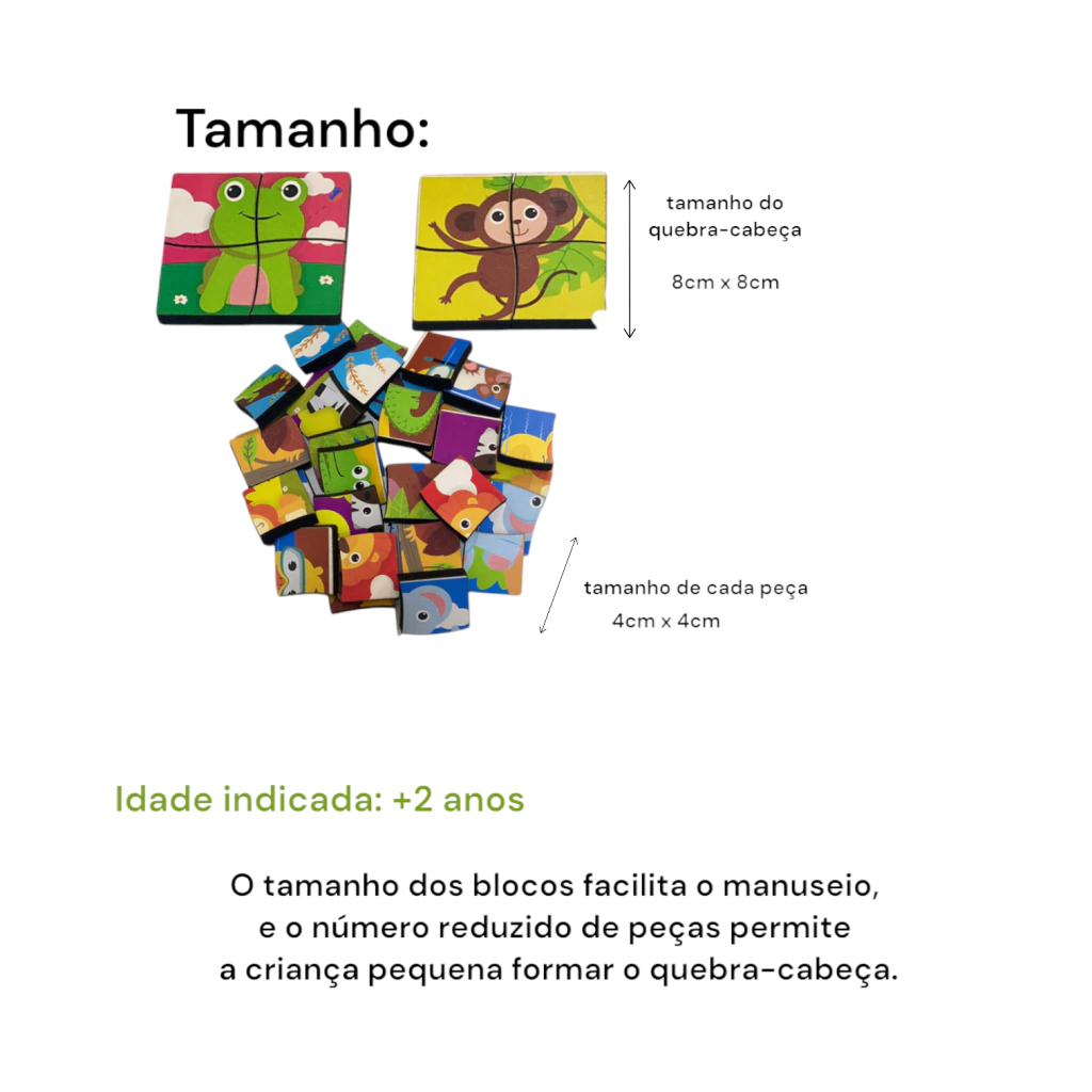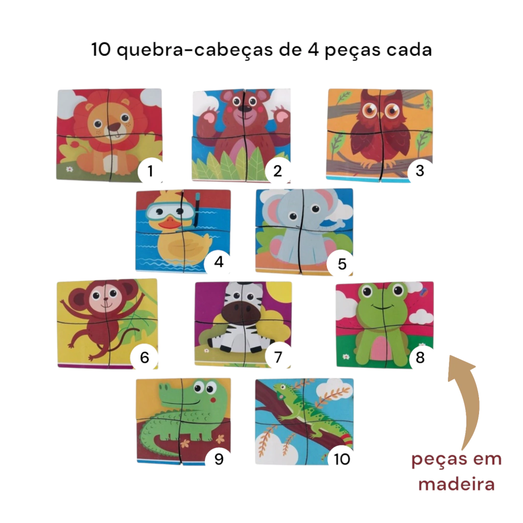 São 40 blocos de madeira que formam 10 animais de 4 peças cada, permitindo desde cedo o envolvimento da criança com elementos lúdicos que estimulam sua imaginação. Desenvolve a atenção, a discriminação visual, o pensamento lógico e a relação do todo com suas partes, tornando-se um desafio que leva a criança à busca de soluções.
