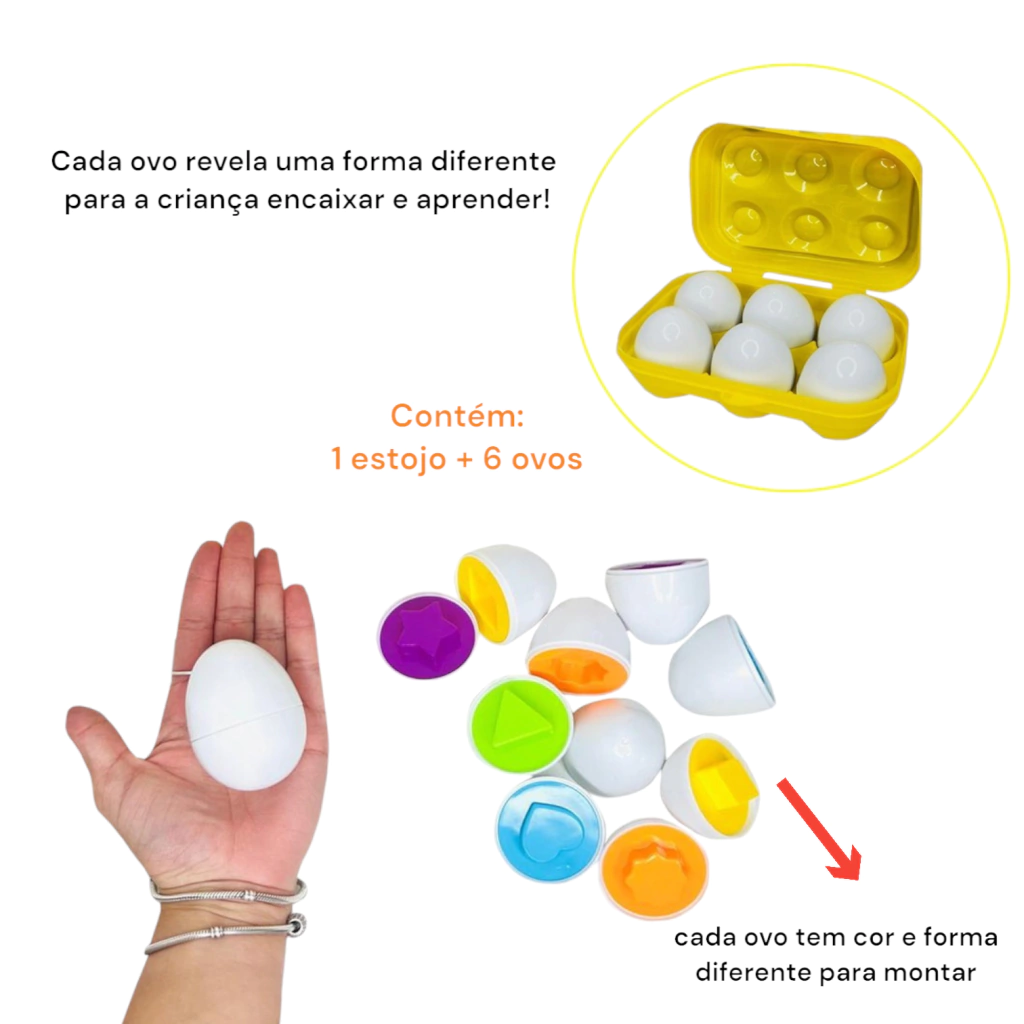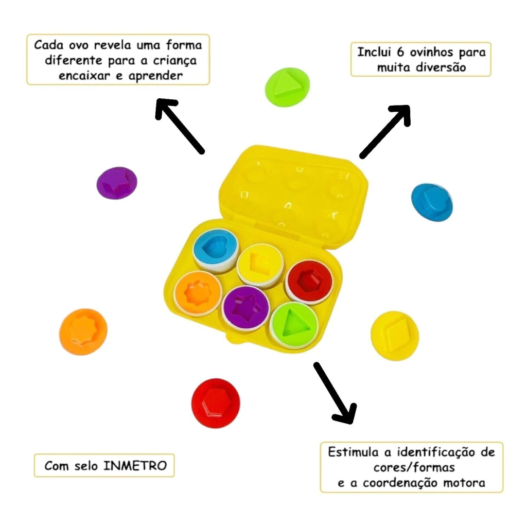 Este jogo inclui um estojo amarelo e seis ovos coloridos com formas variadas que se encaixam em espaços correspondentes, visando estimular a coordenação motora e a identificação de cores e formas.