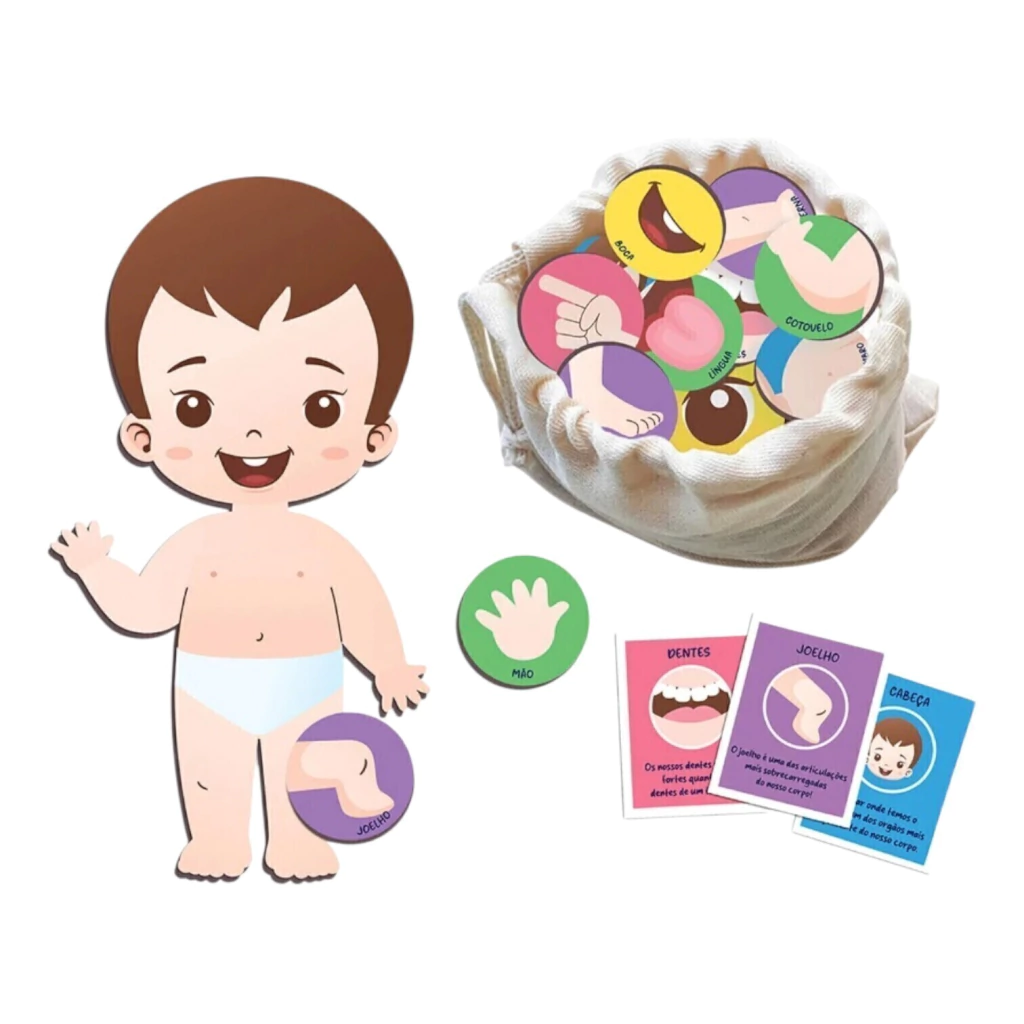 Jogo pedagógico para ensinar a criança a reconhecer as principais partes do corpo e nomeá-las.