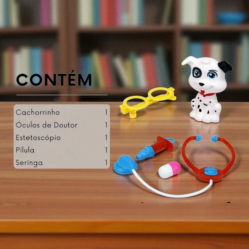 A maleta, feita de plástico resistente, contém um adorável pet e quatro acessórios essenciais: um estetoscópio, óculos, pílula e injeção, permitindo que os pequenos se sintam verdadeiros doutores.