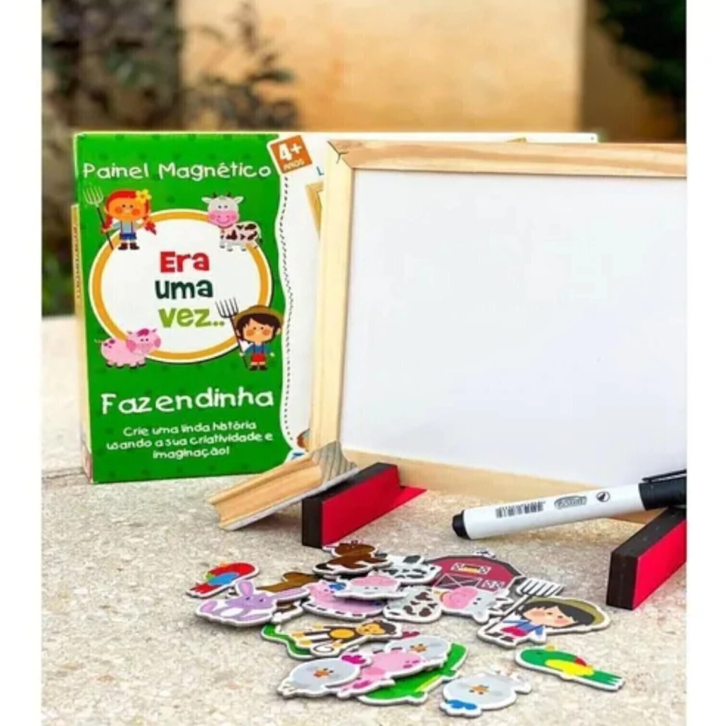 O Painel Magnético Dupla Face Era Uma Vez Fazendinha, é um brinquedo educativo que, de um lado contém uma lousa branca, e do outro lado um cenário magnético, onde a criança irá usar a imaginação e a criatividade, utilizando os personagens para criar lindas histórias de faz de conta!