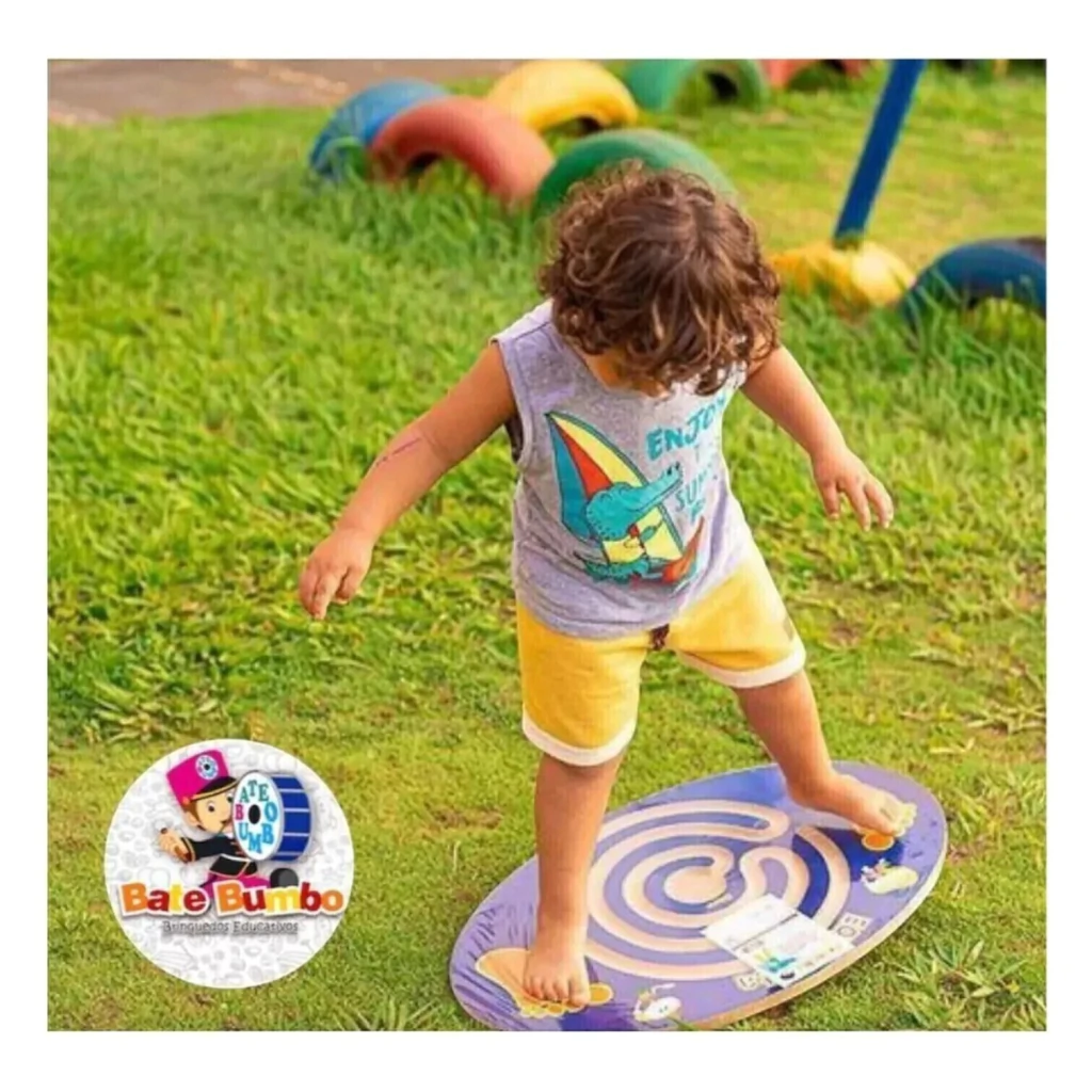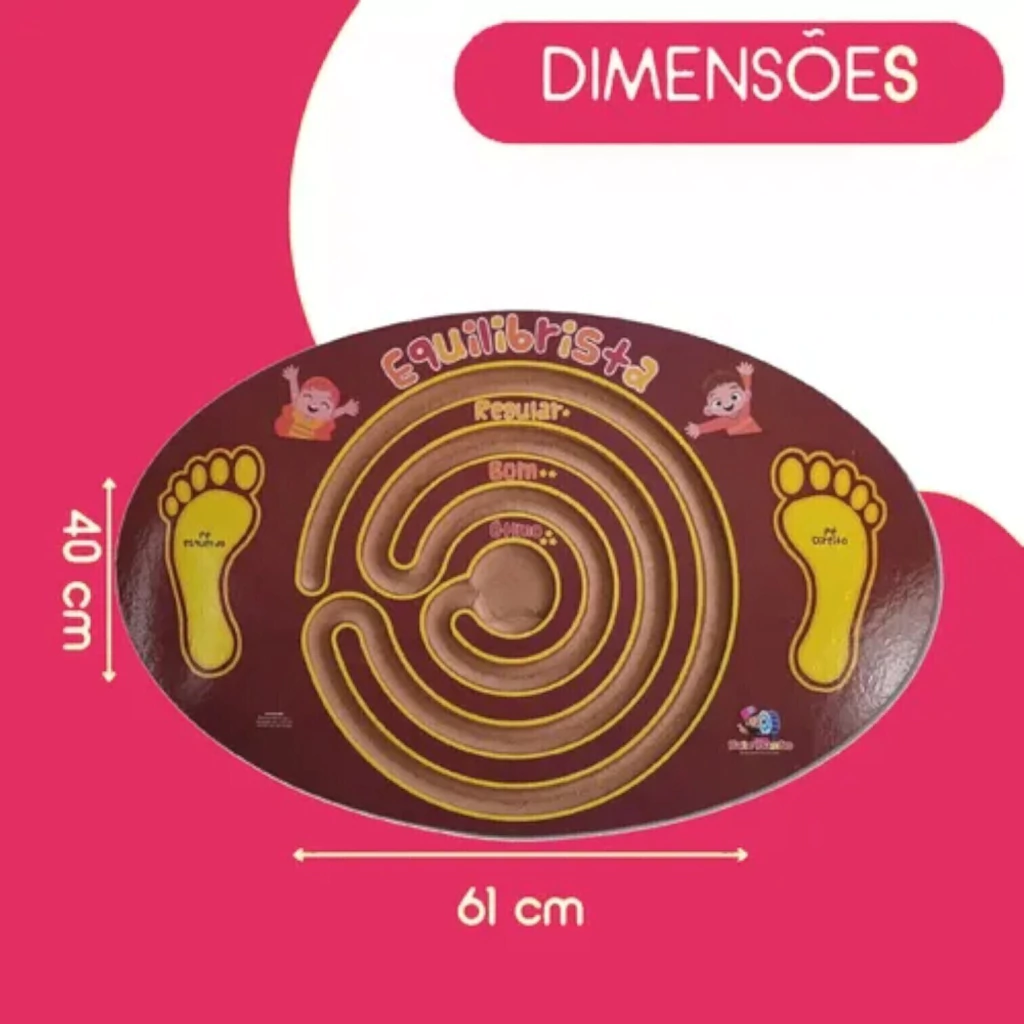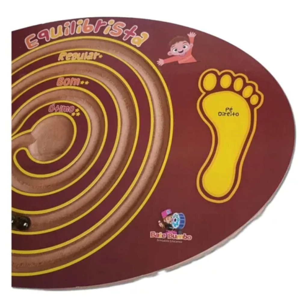 PRANCHA EQUILIBRISTA é um desafio de habilidade e equilíbrio. A criança ficará em cima e, através do equilíbrio, terá como desafio e objetivo levar a bolinha mais próxima possível do centro. Pontuação: regular, bom e ótimo.