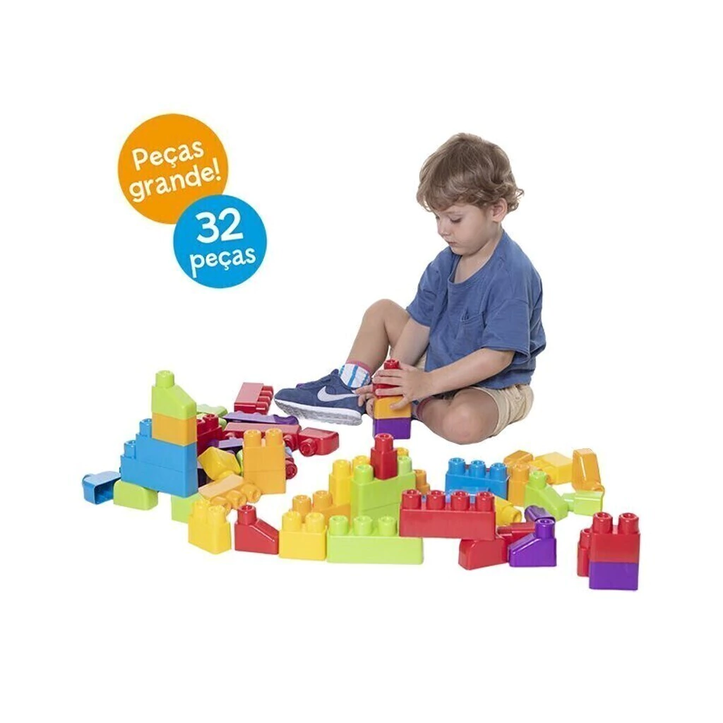 Uma maleta com 32 peças coloridas de Tand Júnior que podem ser montadas de várias formas. Ideal para estimular a criatividade e o raciocínio das crianças.