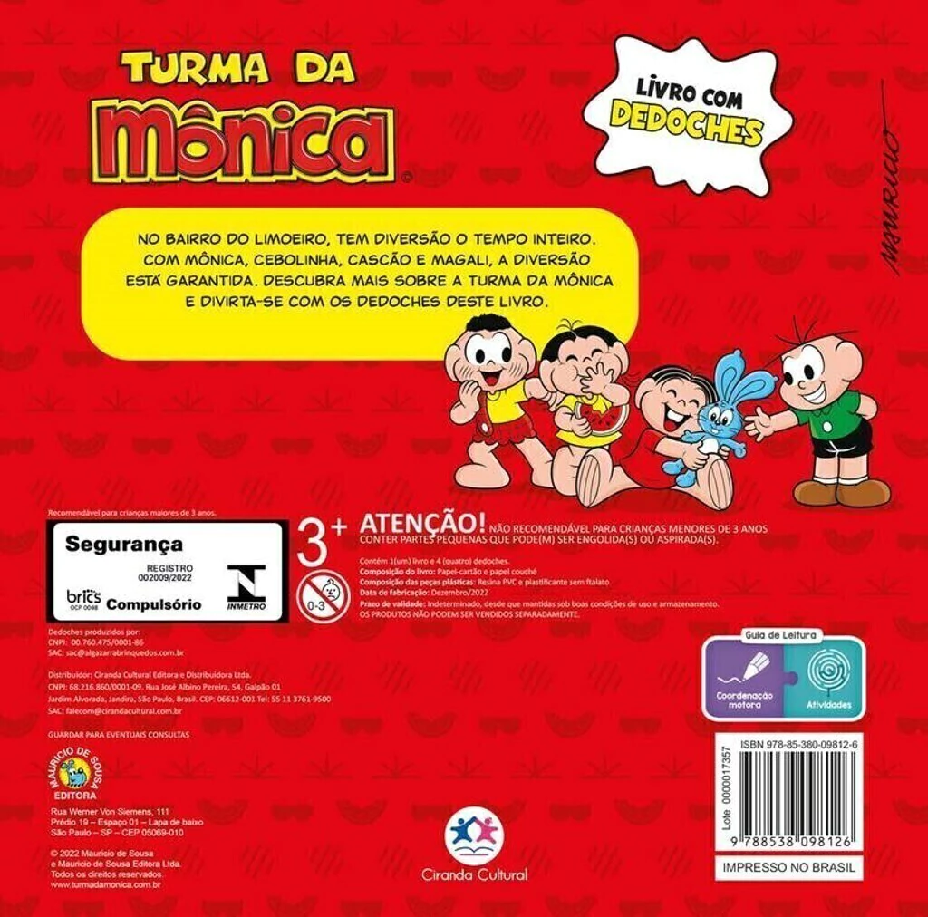 No bairro do Limoeiro tem diversão o tempo inteiro. Com Mônica, Cebolinha, Cascão e Magali a diversão é garantida. Conheça a história da Turma da Mônica e divirta-se com os dedoches deste livro.