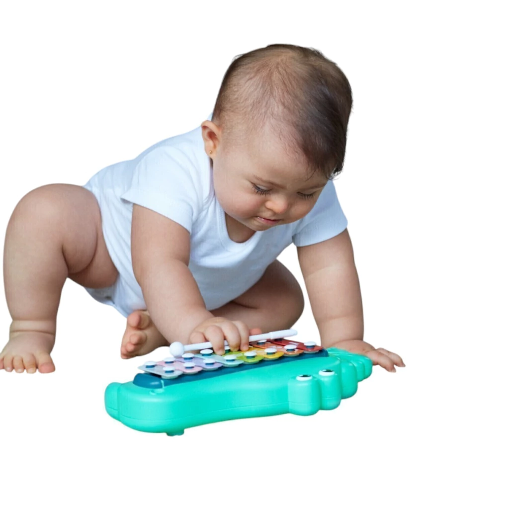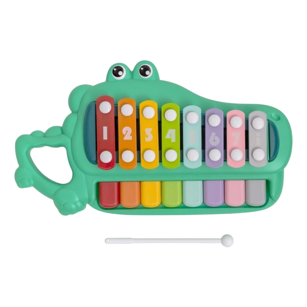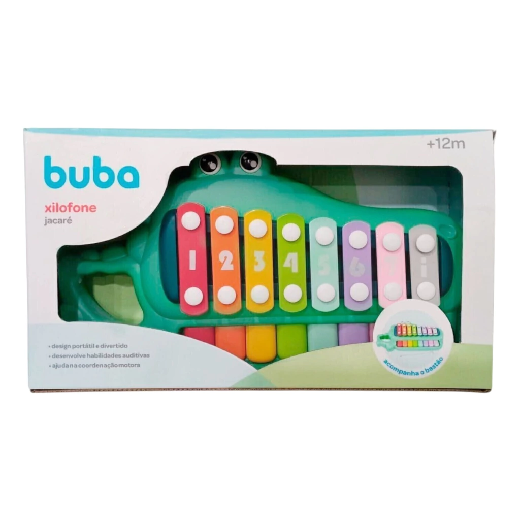 Colorido e divertido, possui formato de jacaré, além de conter alça de transporte para que os pequenos possam brincar onde quiser. Ao tocar as barras com o bastão ou pressionar as teclas com os dedinhos, o brinquedo produz diversos sons que auxiliam na percepção rítmica, bem como tornam as brincadeiras ainda mais divertidas.